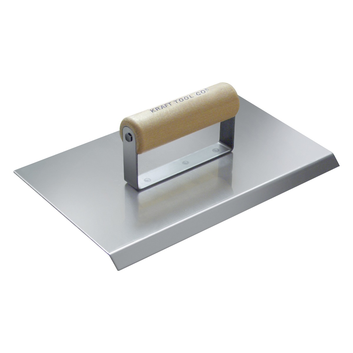 The 10 In. long stainless steel blade moves smoothly along the edge of concrete slabs. The tool is designed to produce a bevel edge on a concrete slab. This edger creates a 45° radius on the edge of concrete slabs to prevent that edge from chipping with wear. The lip extends down 3/4 In. for even coverage along ends and forms. The 6 In. wide tool provides the perfect amount of coverage on large and small slabs. The strong #16 gauge stainless steel blade is long lasting and easy to clean-up. The heavy gauge blade is rivet-free for a flawless finish. A steel mounting welded to the blade attaches the smooth wood handle. Proudly made in the USA.