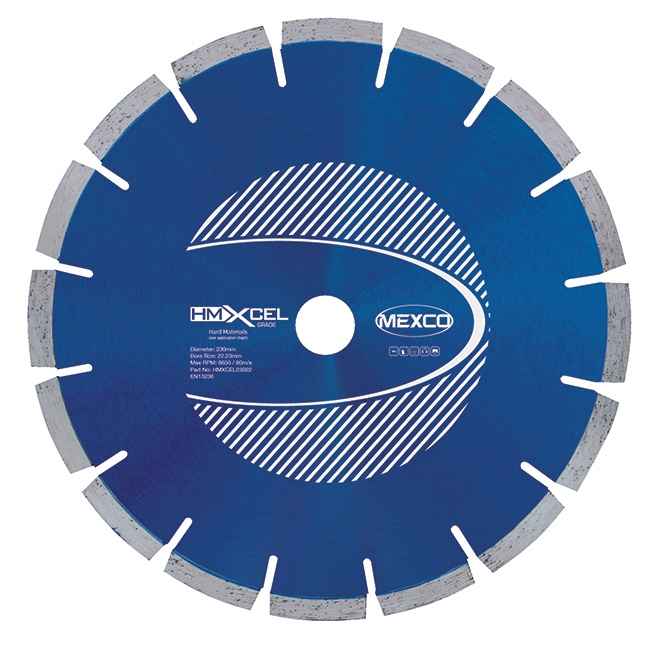 The performance of the HMX – Hard materials diamond blade can be attributed to its narrow gullet design and soft bond matrix allowing new diamond grit to be exposed quicker enhancing cutting characteristics in hard dense products.