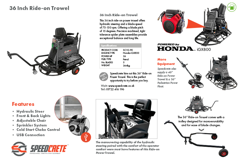 This powerful 36" ride-on trowel has five blades per rotary and is used to make concrete finishing across large slabs and bays achieveable.