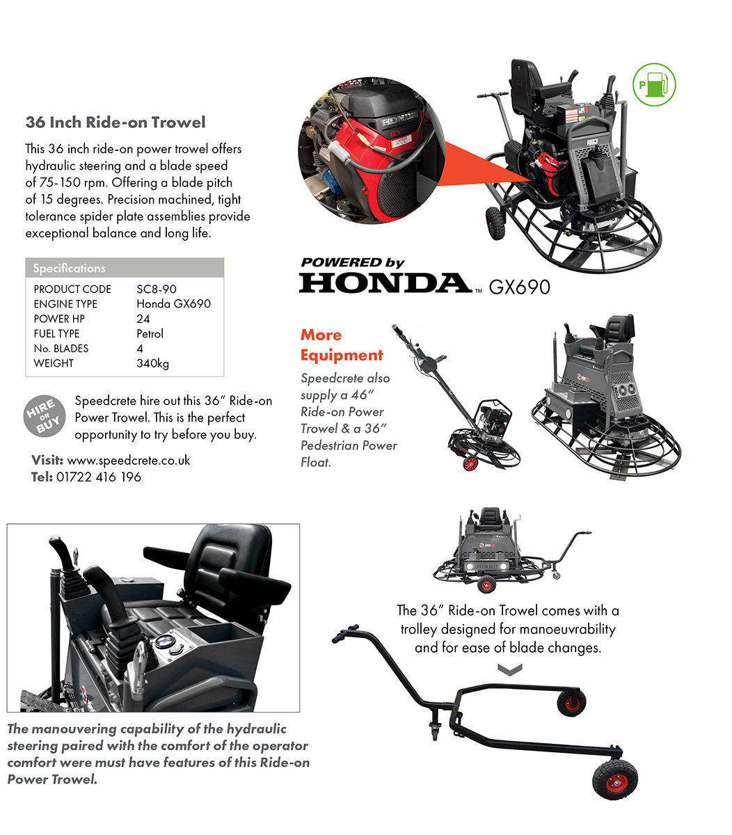 This powerful 36" ride-on trowel is used to level concrete across large slabs and bays. Speedcrete have developed this machine as the ultimate concrete professional rider for the United Kingdom. This four blade float has a hydraulic steer system and pitch control. Powered by the petrol Honda 690 engine this machine is going to rise to any challenge.