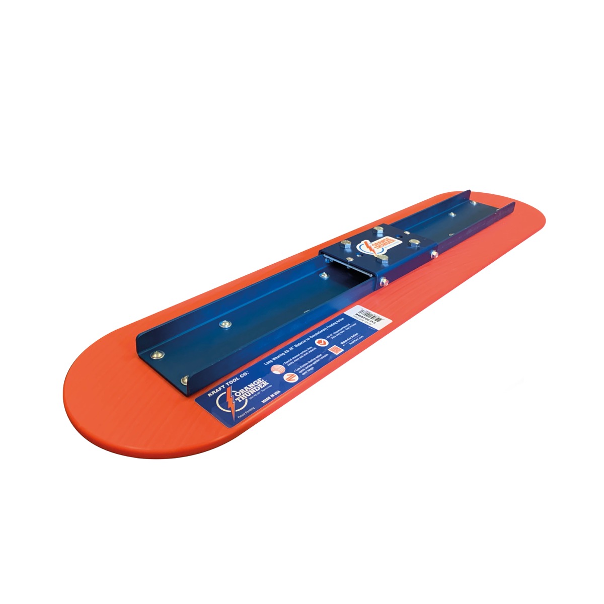 The engineered, curved surface lines help to evenly distributes paste across surface. The machine beveled edges and broken in blade make this bullfloat ready to use. The wear Life of the Orange Thunder Bull Float gives the user extended wear in rough use and superior slide abrasion.
