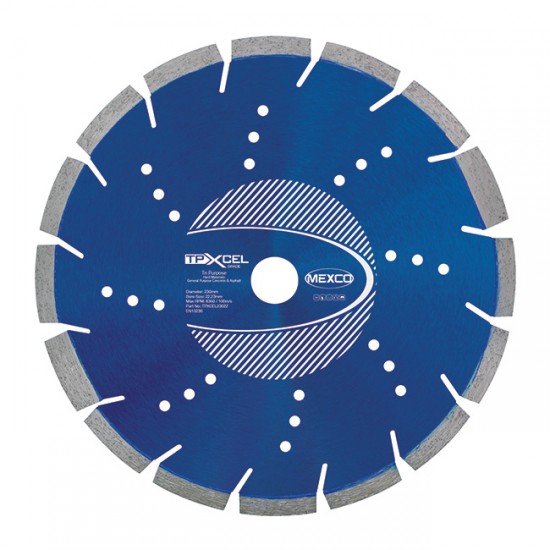 The TPX - Tri-purpose diamond blade makes sure that you have the correct diamond blade for the most common applications. The castellated segment design guarantees a clean finish and quick stock clearance. Also, in addition to its other attributes - it also has ventilation cooling holes within the steel centre, allowing rapid heat dispersion.