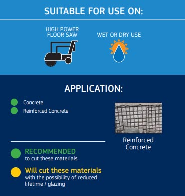 Please ensure the floor saw being used has enough power to drive the blade due to their extra weight and segment width.