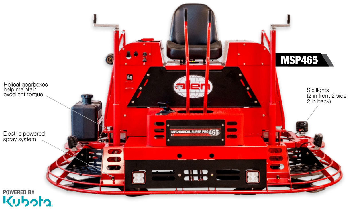All new MSP 465/475 Ride on Trowel model from Allen.. This one has some serious power, featuring a 57HP liquid cooled Kubota Power source it will finish to slabs to a high standard with minimum of fuss.