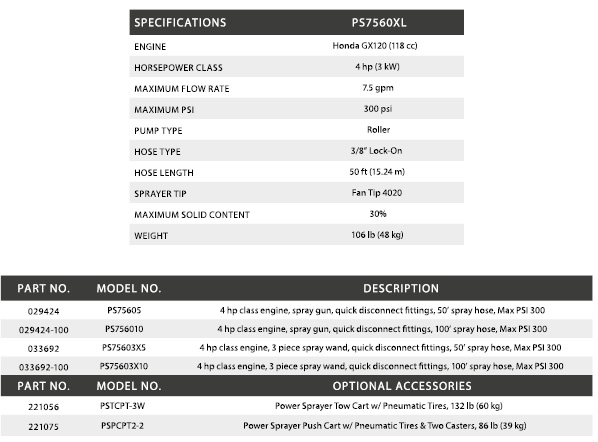 This power sprayer has 4 variations to choose from. The specifications table below shows the universal specifications on each model and the second table shows a description of the different features you can choose from between the 50ft and 100ft hose length versions with or without the wand.