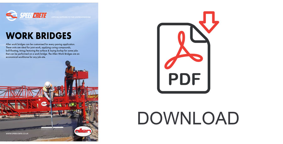 Both powered and non-powered are available in several sizes. Allen Work Bridges can be customised for every application. These work bridges are ideal for joint work, applying curing compounds, bull-floating, patching and filling, applying textures or whenever bridging is required. The Allen Work Bridge is an economical workhorse on any job site.