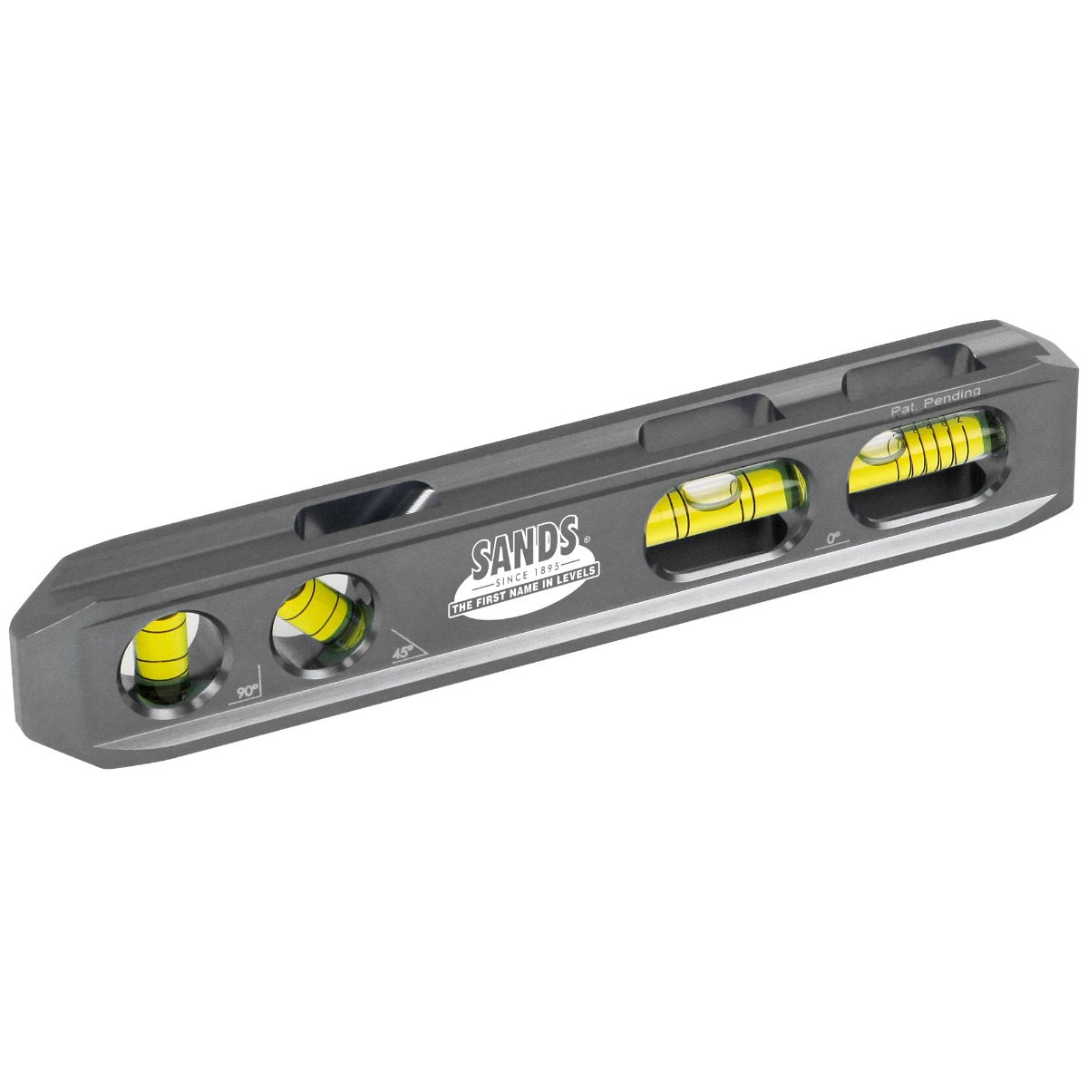 This small yet might level is great for a variety of projects. Heavy-duty aluminum alloy frame makes this level handy for everyday projects, but sturdy for rugged abuse from professional use. This versatile level has four easy-to-read high quality vials. The bright yellow vials provide a strong contrast to the grey frame for ease in reading. The four vials allow for measurements at level, plumb, 45°, and Variable Pitch. The Variable Pitch vial has markings in 1/8" graduations up to 1/2". The vials are positioned to allow for viewing from multiple angles. The top of the level features a groove to sit securely on pipes and other rounded surfaces. This feature coupled with the variable pitch vial makes this a popular choice for plumbing to ensures proper slope for drainage. Strong magnetic bottom expands the versatility, also great for use with metal studs. Markings are laser etched so they won't fade or wear away. The handy 8" size fits in pockets and tool bags with ease. Patent Pending design.