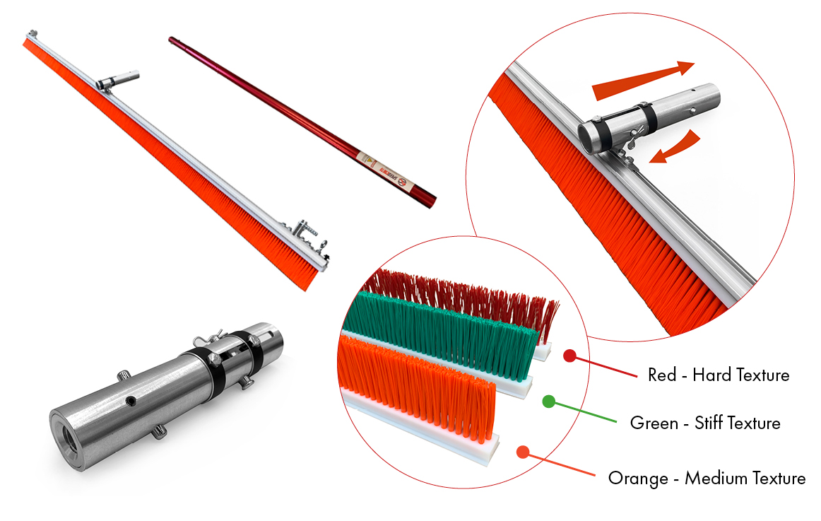 The chameleon Single Brush System for textured concrete finishing is available in 4ft, 6ft, and 8ft widths. The #612 Dupont Nylon Resin high density polyethylene block and aluminium extruded channel makes this the most durable concrete texturing brush on the market.