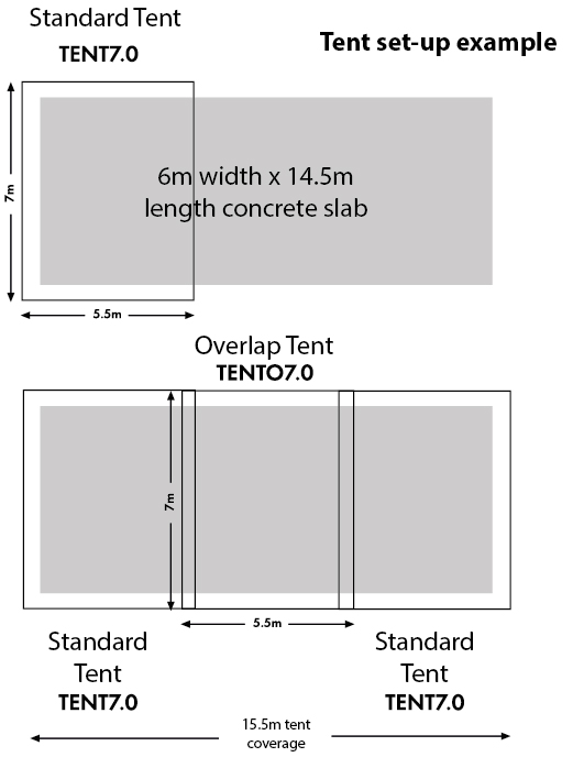 Our Concrete Tents will cover a bay size 1 meter less than stated dimensions. The dimension tolerance allows for sufficient overlap to prevent water ingress onto the slab surface. For example a 7 x 5.5mtr tent will cover a bay width of 6 meters and a linear length of 5 meters. A series of tents can be run to any desired bay length by alternating the standard and overlap tents down the length of your bay. See the illustration below for an example of using Standard and Overlapping tents.
