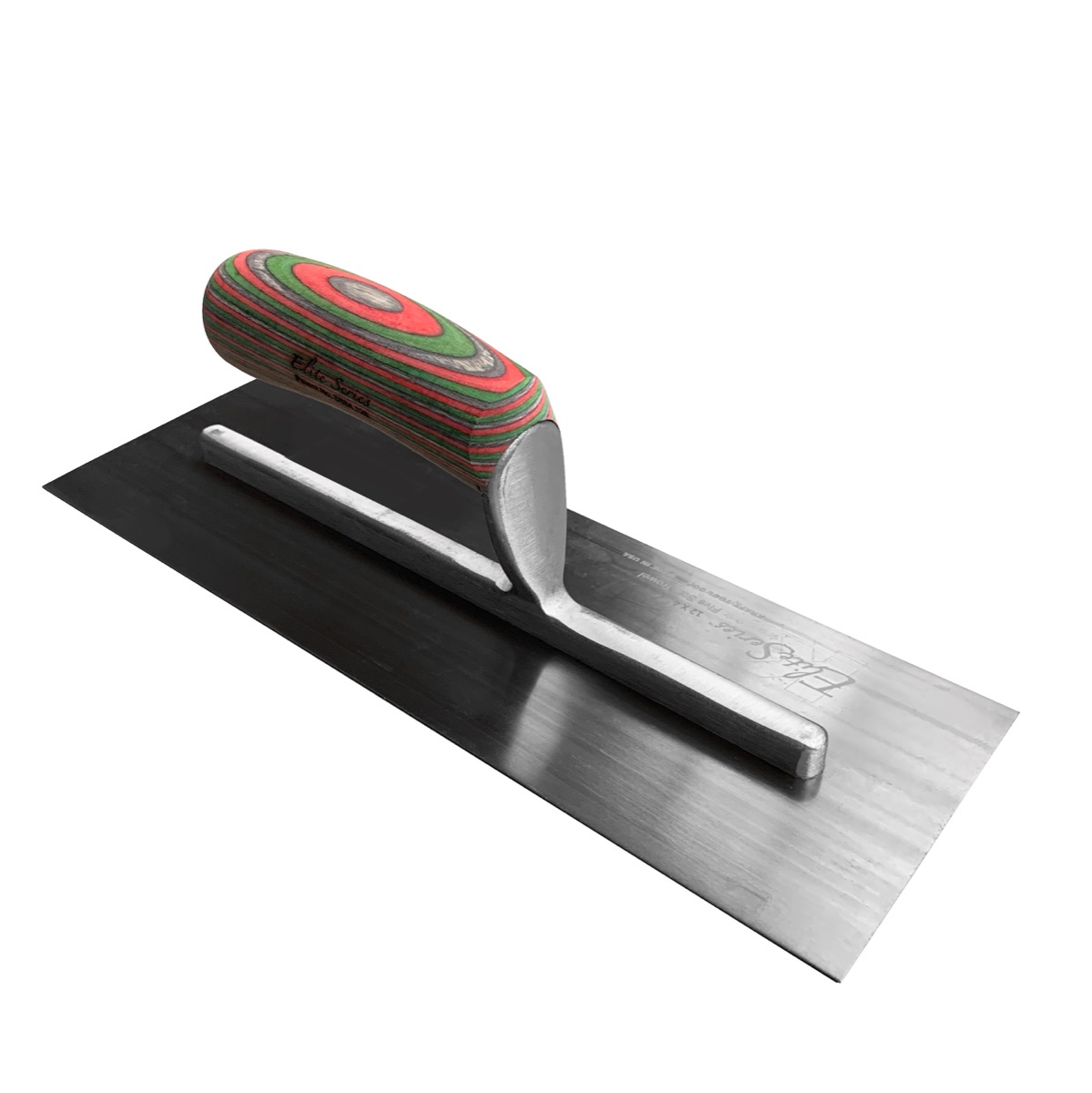 The square blade finishes all the way to the corners to complete projects large and small. A high-strength, lightweight cast aluminium mounting stands up to the rigors of cement work. Compression fit stainless steel power pin rivets attach the mounting to the blade. An oversized toe rivet provides extra strength when applying pressure during finish work. Guaranteed No-Turn handle design locks the handle to mounting. Kraft Tool's premium flat trowel with patented laminated hardwood handle provides a comfortable grip. The uniquely colored handle is distinctive and easy to spot on a jobsite. The contoured camelback shape of the handle reduces fatigue and provides a great grip.