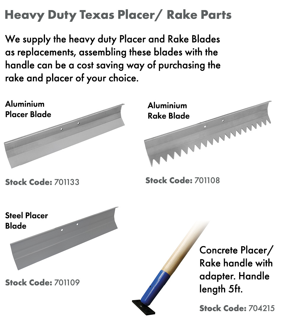 Concrete Texas Placers are a heavy duty concrete grading tool which will hold up under the toughest of jobs.