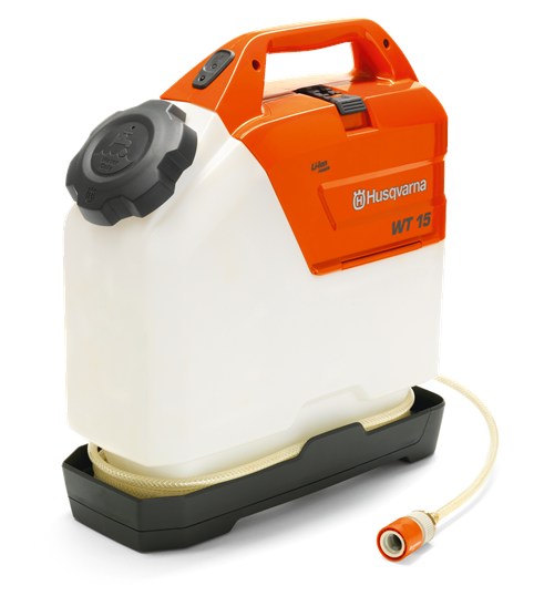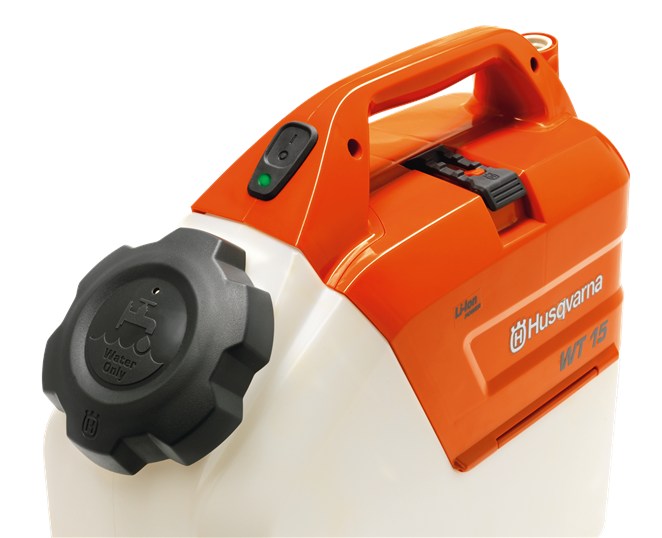 Husqvarna WT 15 comes equipped with a Lithium-Ion battery, charger and a Gardena spray nozzle, conveniently placed in a compartment on the WT 15. A fully charged battery will give a continous running time of 45 minutes.