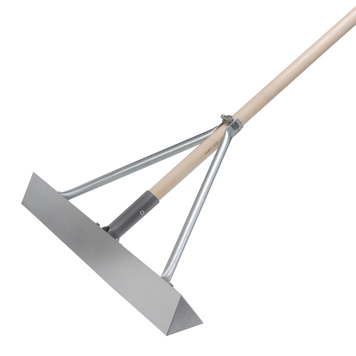 Adjusting the height of the handle allows the user to engage the surface of tool for smoothing, or moving to engage the point of the triangle for checking flatness on slabs. Braces extend from the ends of the blade up the handle for support of the 3 Ft. long blade. A 60 In. strong wood handle completes the tool. Ships unassembled. Proudly made in the USA.