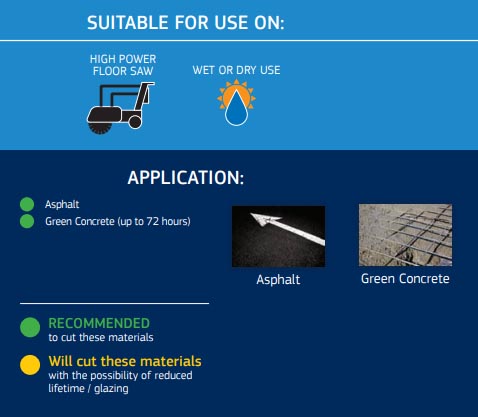 Please ensure the floor saw being used has enough power to drive the blade due to their extra weight and segment width.