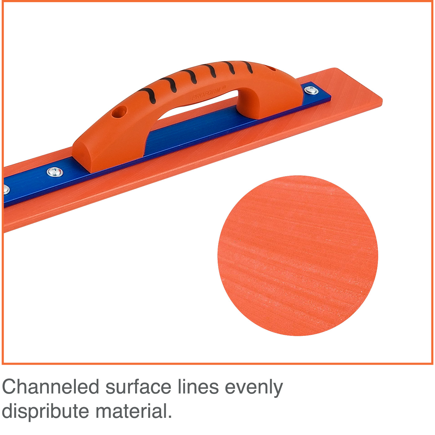 The blade won’t absorb liquids preventing corrosion and rust. Kraft Tool's innovative new hand float is reinforced with an aluminum bar to mount the patented ProForm soft grip handle (US Pat. 6,473,939 B1 and US Pat. 6,821,468 B2). Enhanced texture ribbing of the handle reduces fatigue and provides a great grip even when wet.