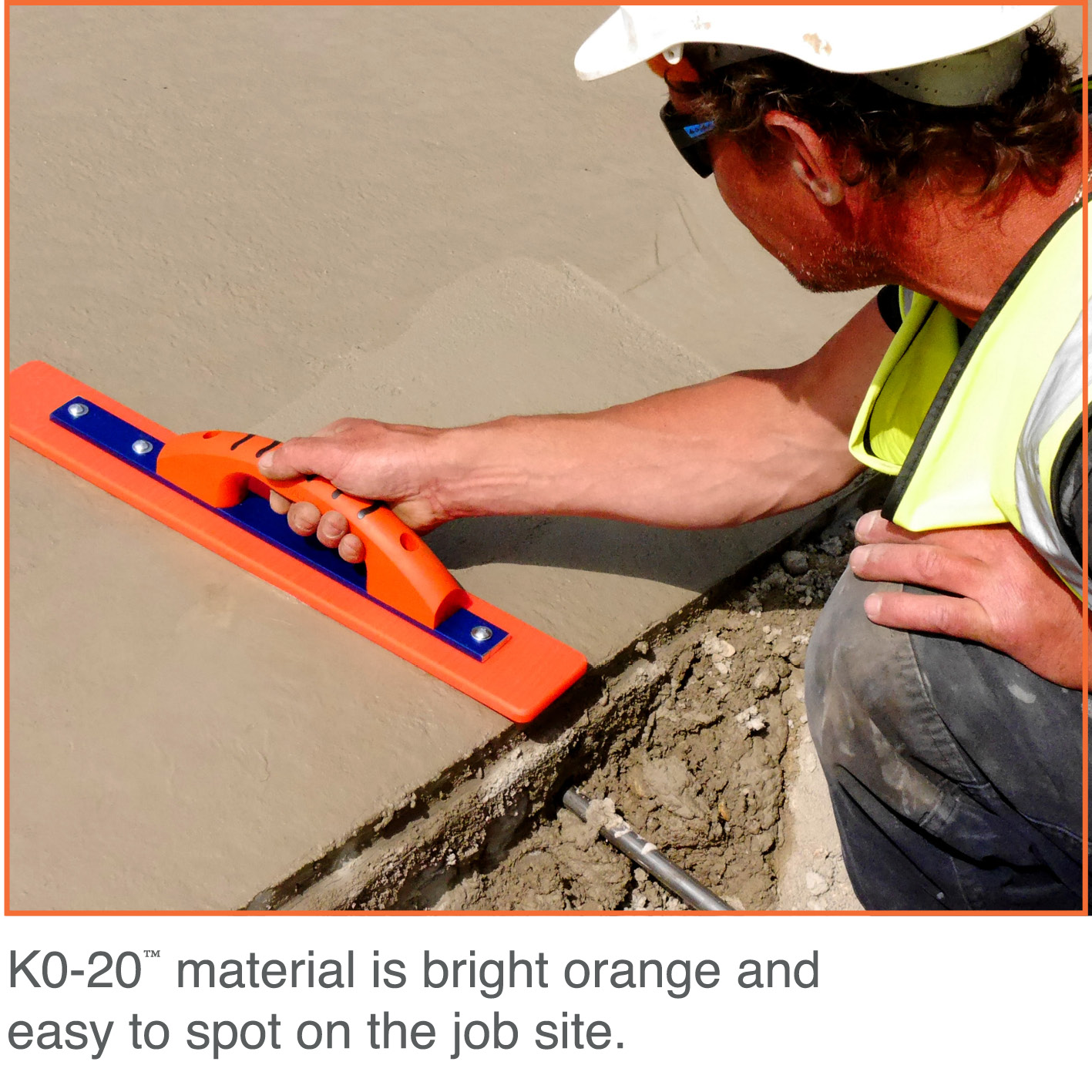 The latest technology in concrete floating! The Orange Thunder™ with KO-20™ Technology Hand Float is made with the latest advancement in construction tools. Lightweight engineered material allows for seamless motions to quickly bring up bleed water to open up the surface as it levels and smooths. Low surface friction allows the blade to move faster across the surface with less drag. This 20" hand float features curved surface lines to evenly distribute the paste to keep the surface open longer. The blade grips the surface for working on inclines without downward drift. The 3" wide square end blade has rounded corners to prevent gouging. KO-20™ material is impact resistant for extended wear.