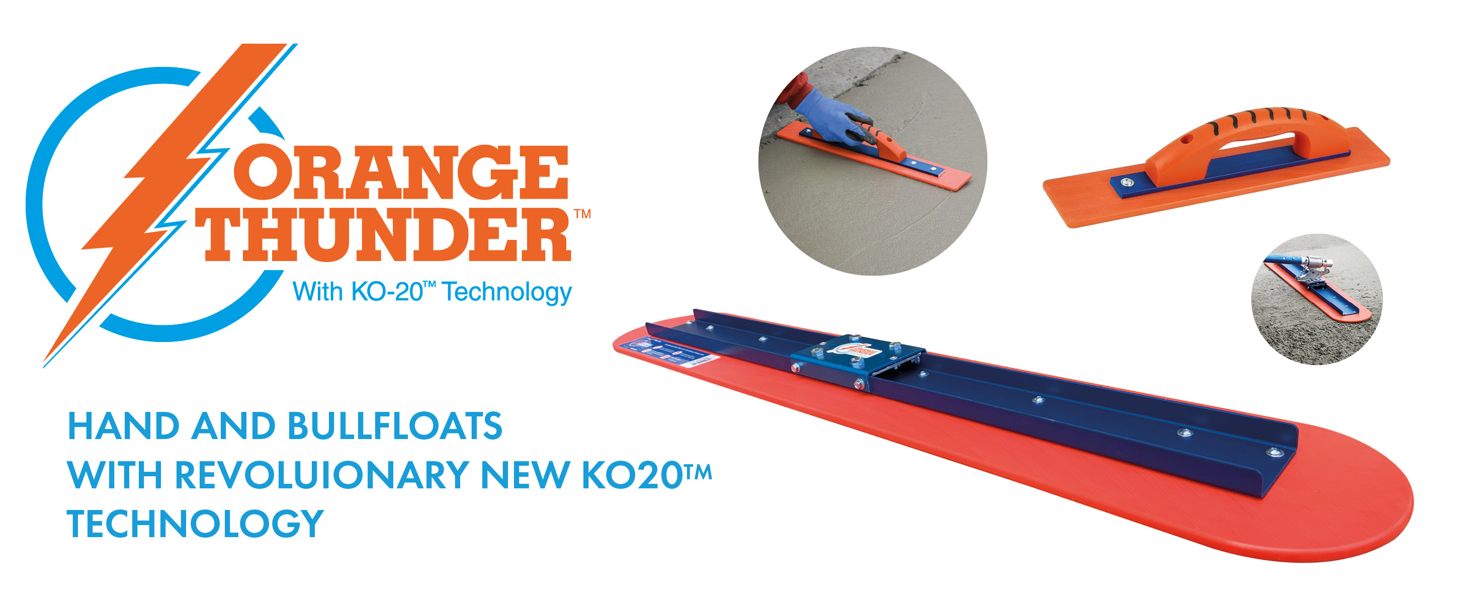 Introducing Orange Thunder Hand Trowels made from K0-20™ material. This unique high performing engineered material has been specially developed for the concrete finisher. Formulated as a tougher, lighter, and longer-wearing alternative to aluminium, canvas-resin, magnesium, steel, and wood, Speedcrete are excited to offer these tools to the United Kindom market from the USA.