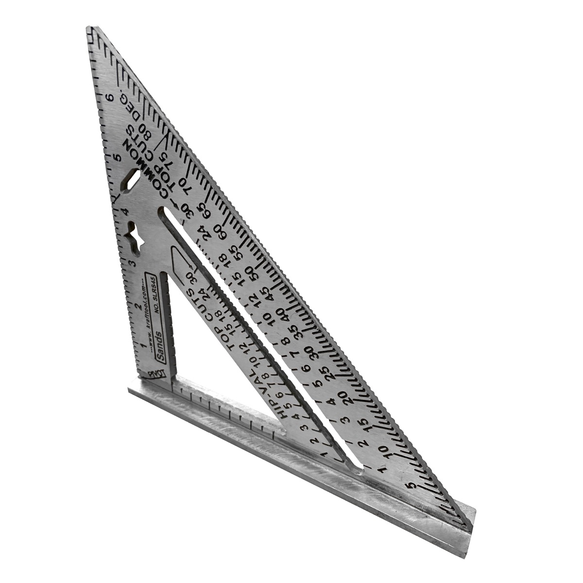 With a durable, yet lightweight aluminium construction. Both sides of this 7" square has easy-to-read dark, permanent graduations imbedded into the surface. The grey color has a flat finish to prevent glare when working with this tool. A 7/8" lip on one side of the triangle rests on the end of boards and walls for easy marking. Marked at 1/8" graduations.