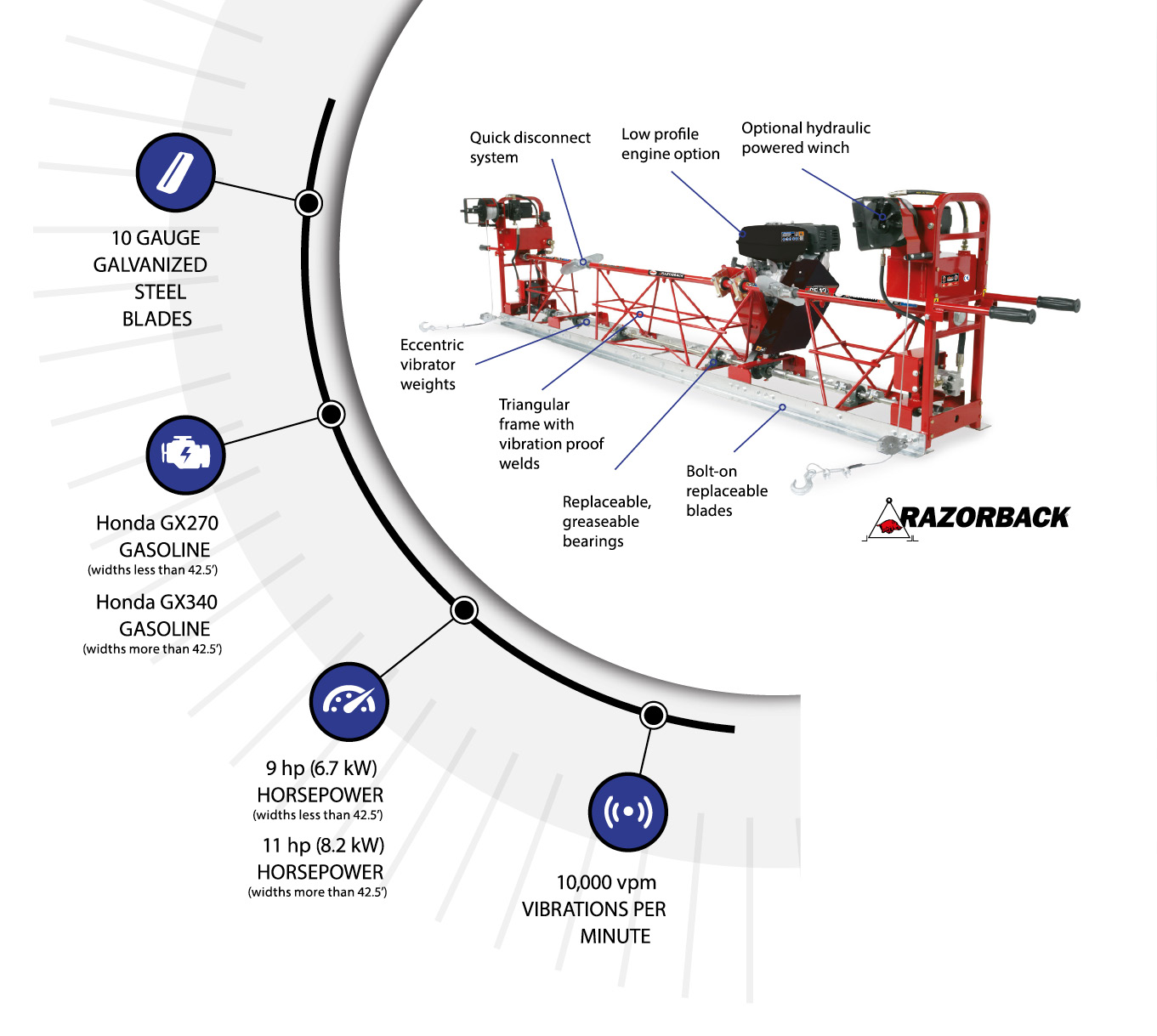 These engine-driven Allen® Razorback® Truss Screeds has been used on countless concrete projects around the globe for over four decades. With petrol engine power, driving vibration along the form via a winch system, this self-contained truss screed is the industry standard for all steel framed truss screeds.