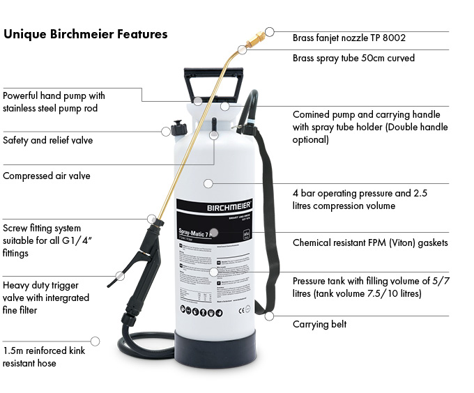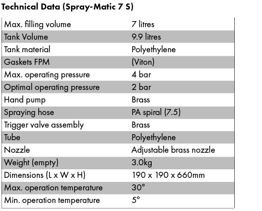 The Spray-Matic 7 P Â has a brass fanjet nozzle TP 8002and is TUV/GS approved and has 2.5 litres of pressure space, plus safety valve.
