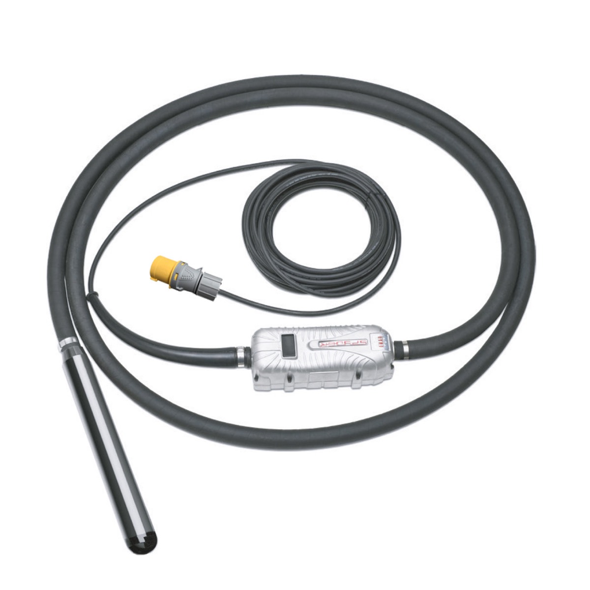This Spyder Baby Pro high frequency concrete poker. This model is called the "baby" because it has a 4 metre flex which is shorter than the 7 metre standard model. This model has a 15 metre power cord.