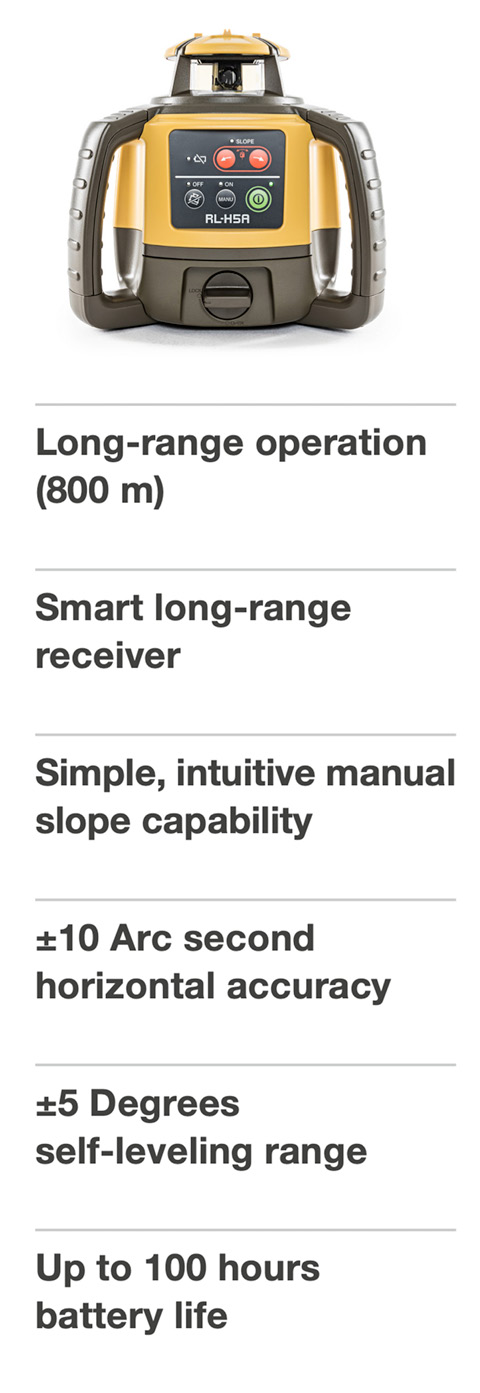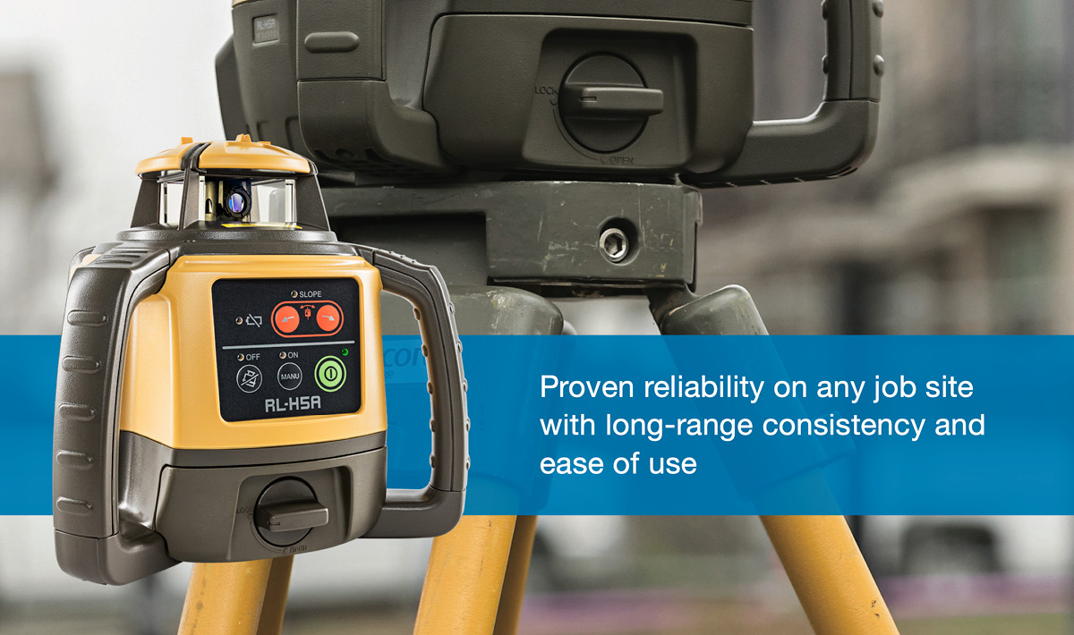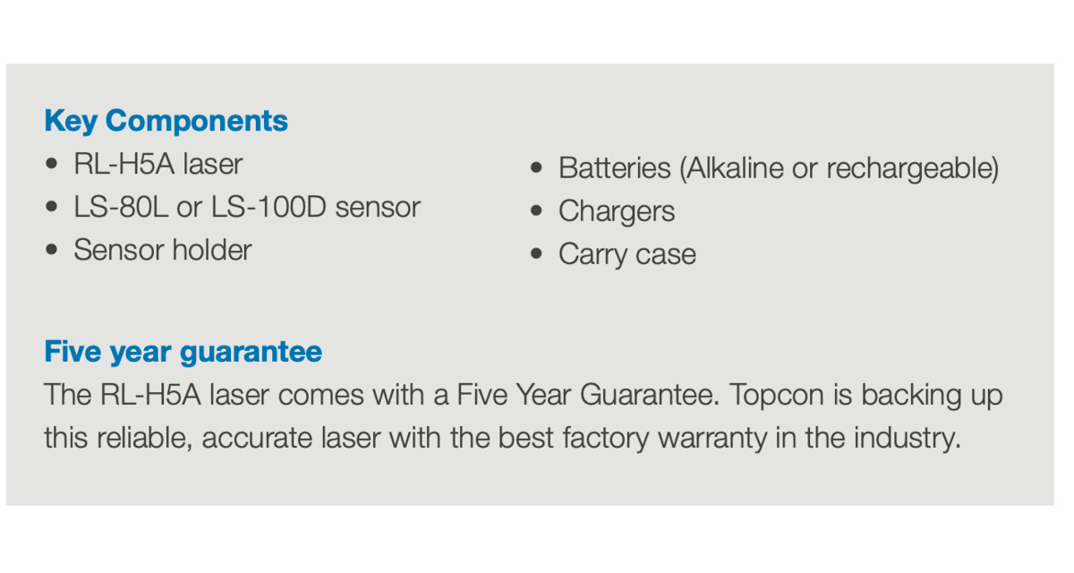 The RL-H5A kit is the self levelling, accurate, reliable, multi-purpose construction laser produced by Topcon Laser is accurate and reliable long-range, multi-purpose construction laser level.