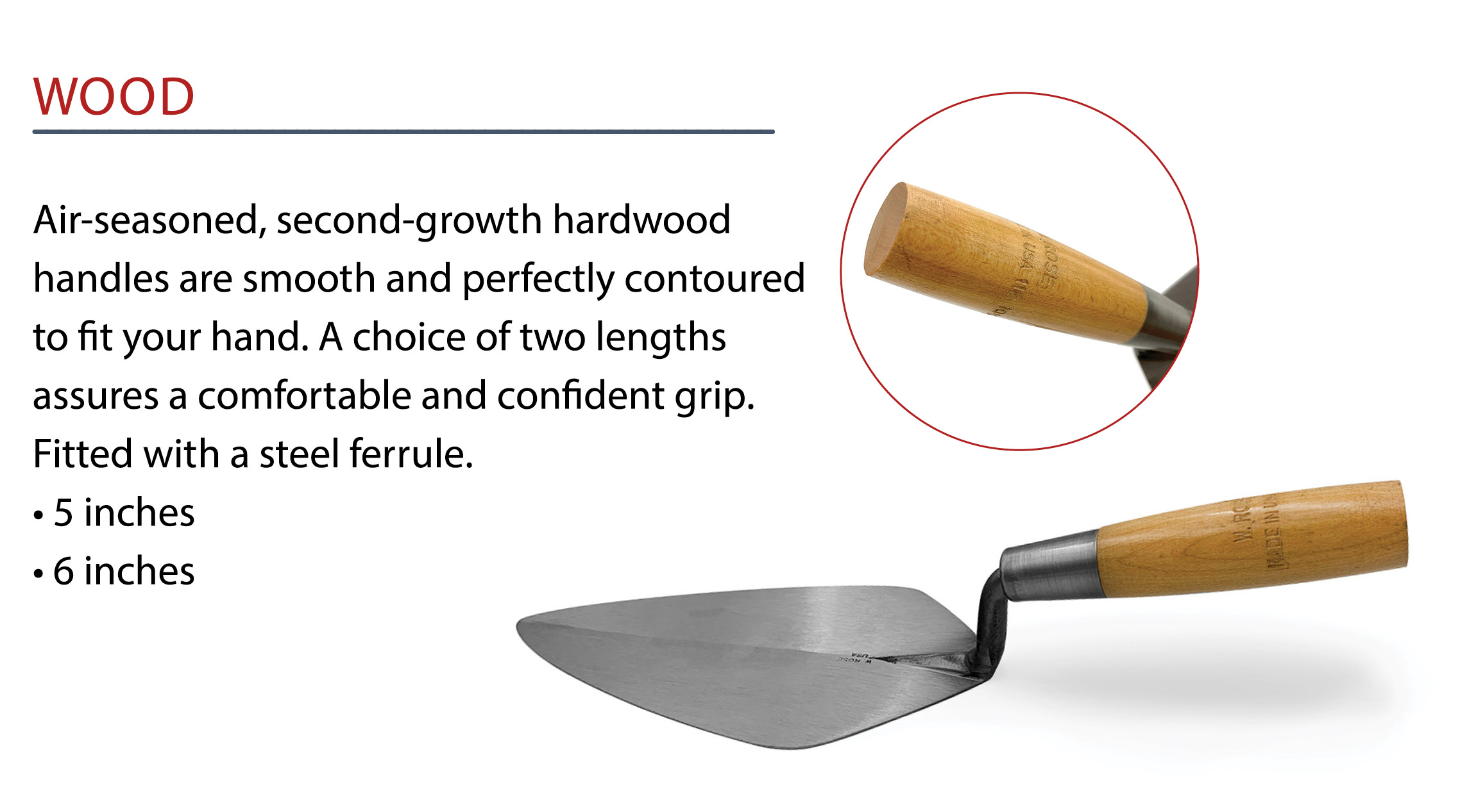 The angle of the standard shank is specially balanced to reduce wrist fatigue. Many of our popular trowel patterns are also available in low lift shanks as some masons may prefer.