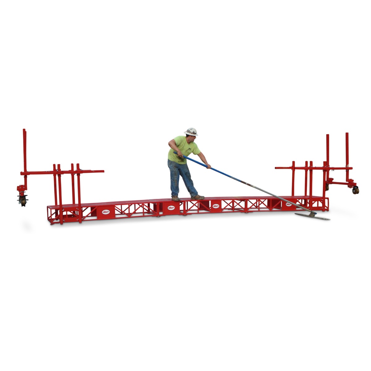 The 1224 Work Bridge is the smallest size work deck Speedcrete supply for the paving line. This unit is typically used in single lane paving or small bridge deck applications and has also been used in archelogical work. The unit can be equipped with cupped wheels or rubber tyres depending on the project needs. Typical uses: texturing, curing, bull floating and laying burlap.Â