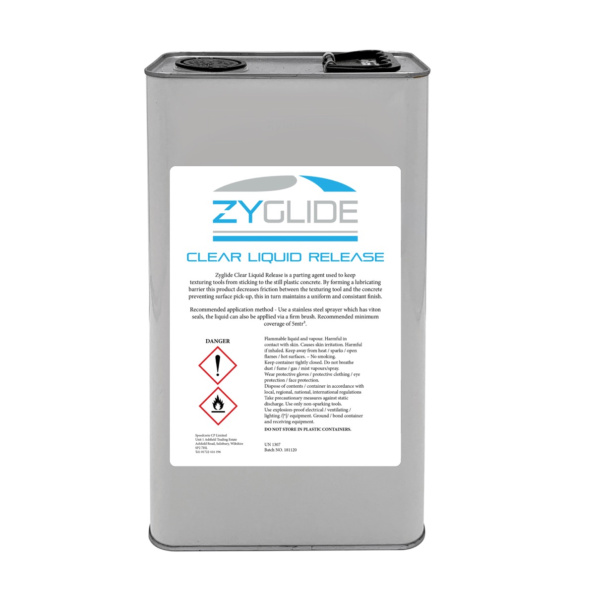 Speedcrete supply Zyglide Clear Liquid Release. This product is a parting agent used to keep texturing tools from sticking to the concrete at what is called the 'Plastic stage'. This release agent has become increasingly popular replacement for thinners and for keeping tools clean.